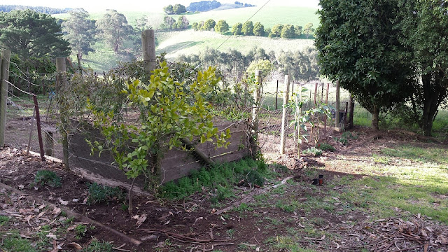 I also managed to get the lemon tree and all of the succulents saved from our last house into the ground, then added to the main garden the kaffir lime and a dwarf rhubarb. Closer to the house I added a small persian rose bush called 'for your eyes only' to the garden and I planted the coffee bush, which wasn't looking particularly healthy (though that could just be the cold), near one of our water tanks which is prone to overflowing. Apparently coffee plants like plenty of water.